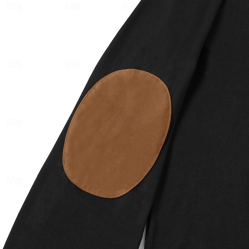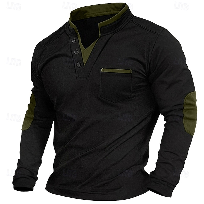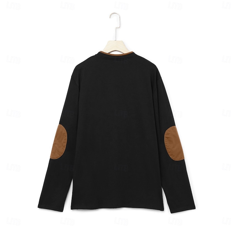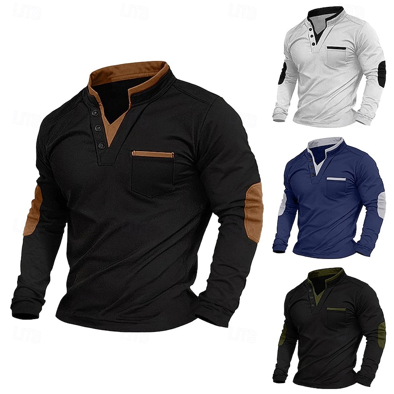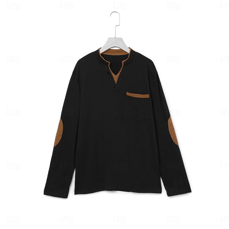 Featuring a modern V-neck Henley collar with button details, this shirt includes contrasting brown patchwork accents around the collar, pocket, and elbow patches. These elements add a sophisticated and dynamic visual appeal, while the fashion-forward fake two-piece style adds a unique touch to your wardrobe.