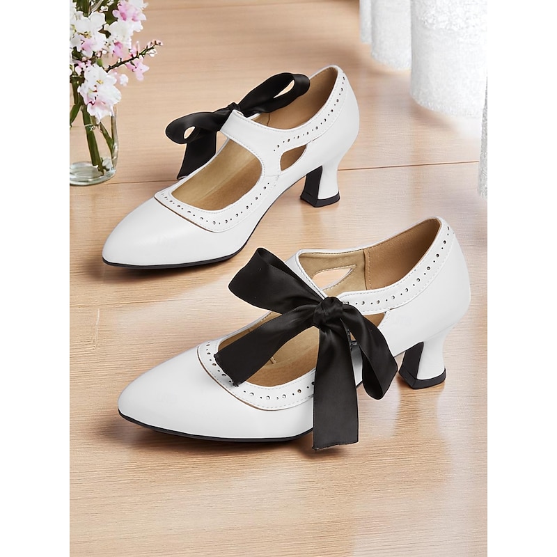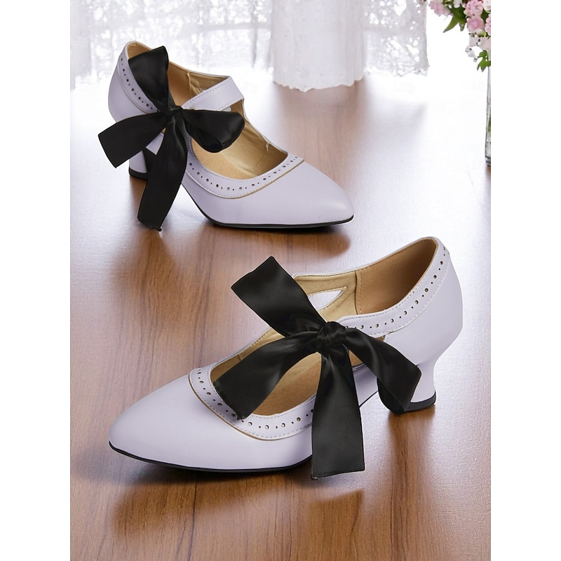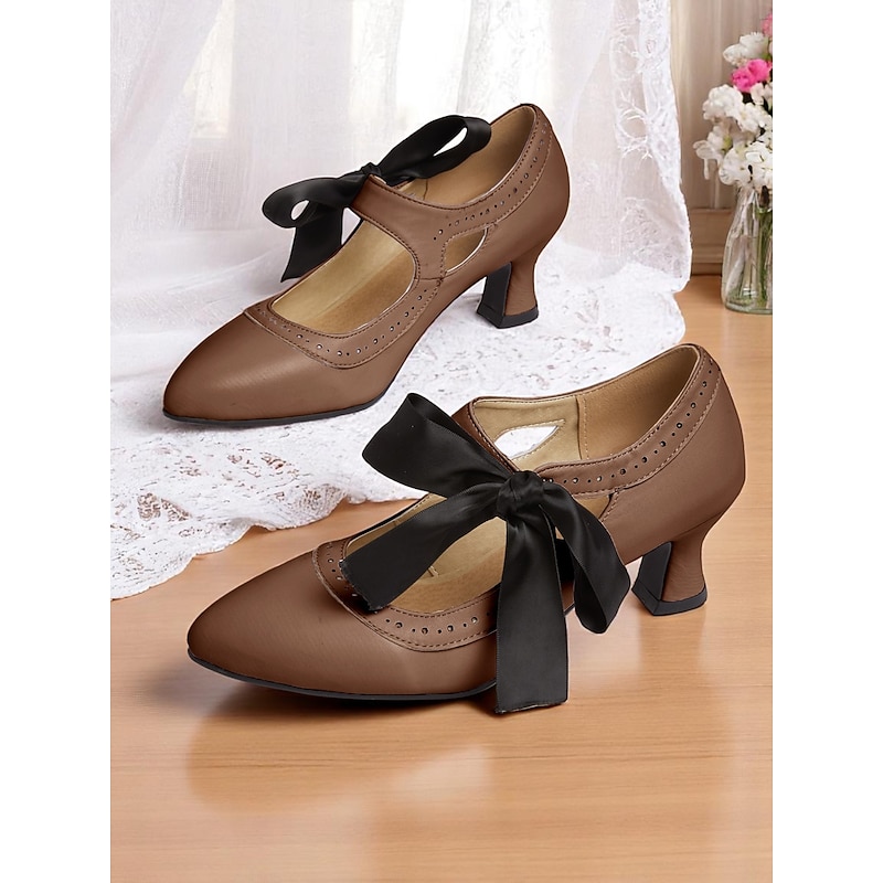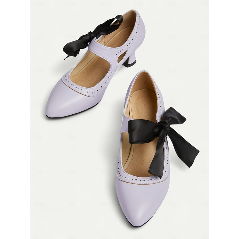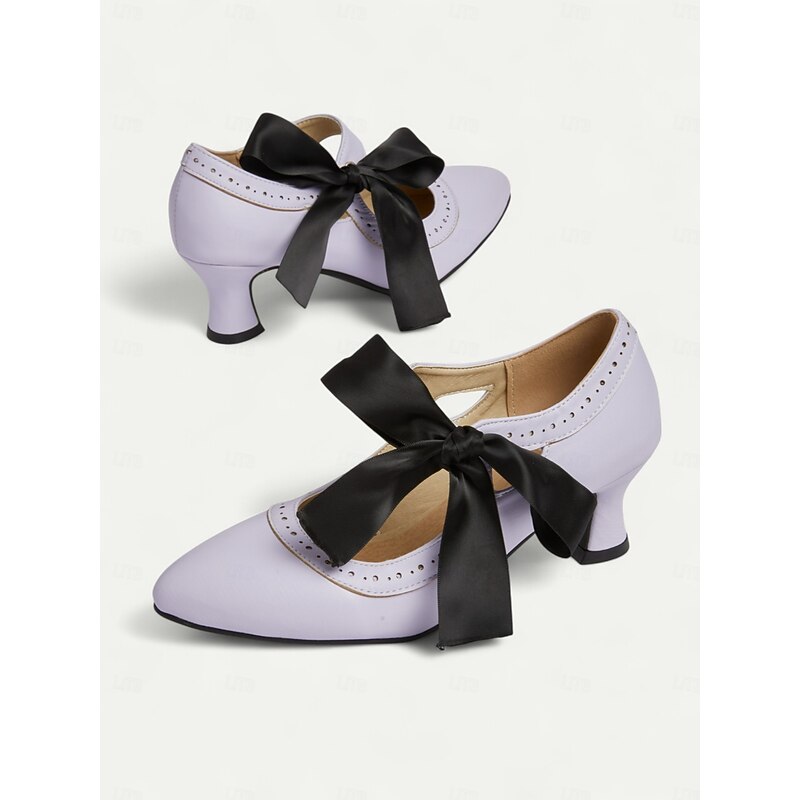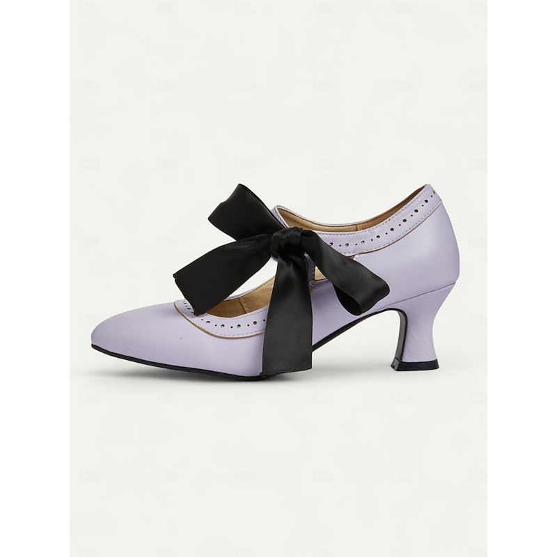 sought-after ! Women's Edwardian Vintage Gatsby Ribbon Heels-1900s Style Purple Mary Jane Shoes with Black Bow, Cutout Design and Curved Mid Heels for Historical Cosplay, Retro Tea Parties and Costume Events