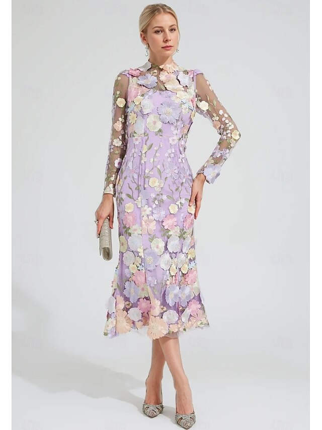 Floral Embroidered A-Line Dress Mother of the Bride Dress Wedding  Elegant Vintage Illusion Neck Ankle Length Tulle Long Sleeve with Appliques Flower 6