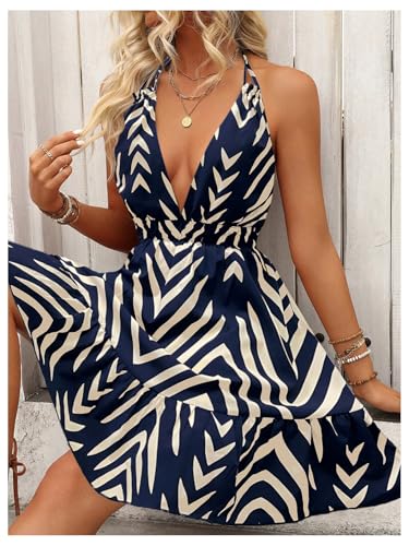 - Feature: Halter, tie back, backless, chevron print, ruffle hem, sleeveless, deep v neck, beach vacation dress, womens dresses, fashionable