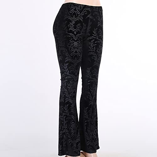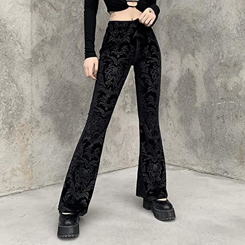 Women's Gothic Embossed Flare Pants Black Velvet Elastic Waist Bell Bottom Trousers 6