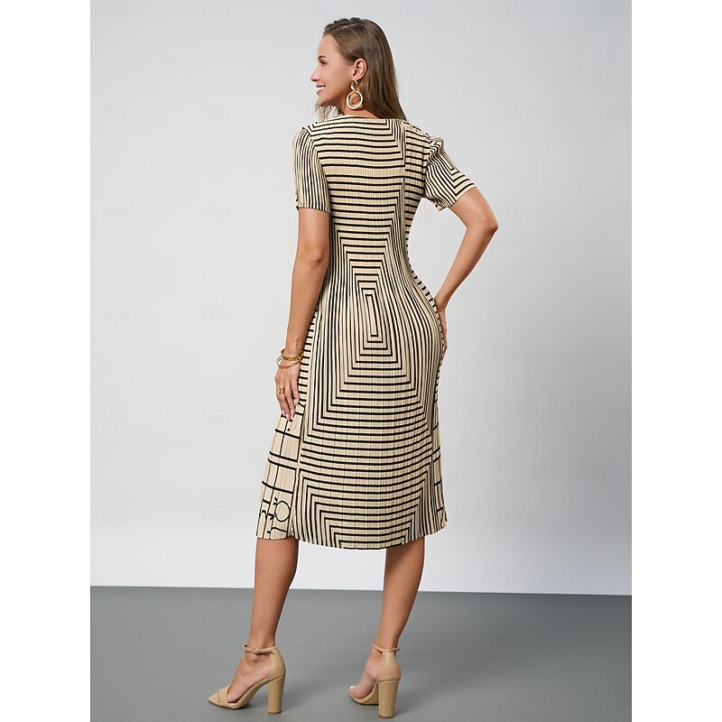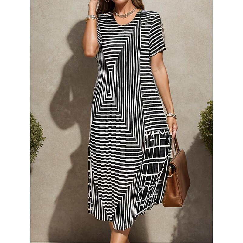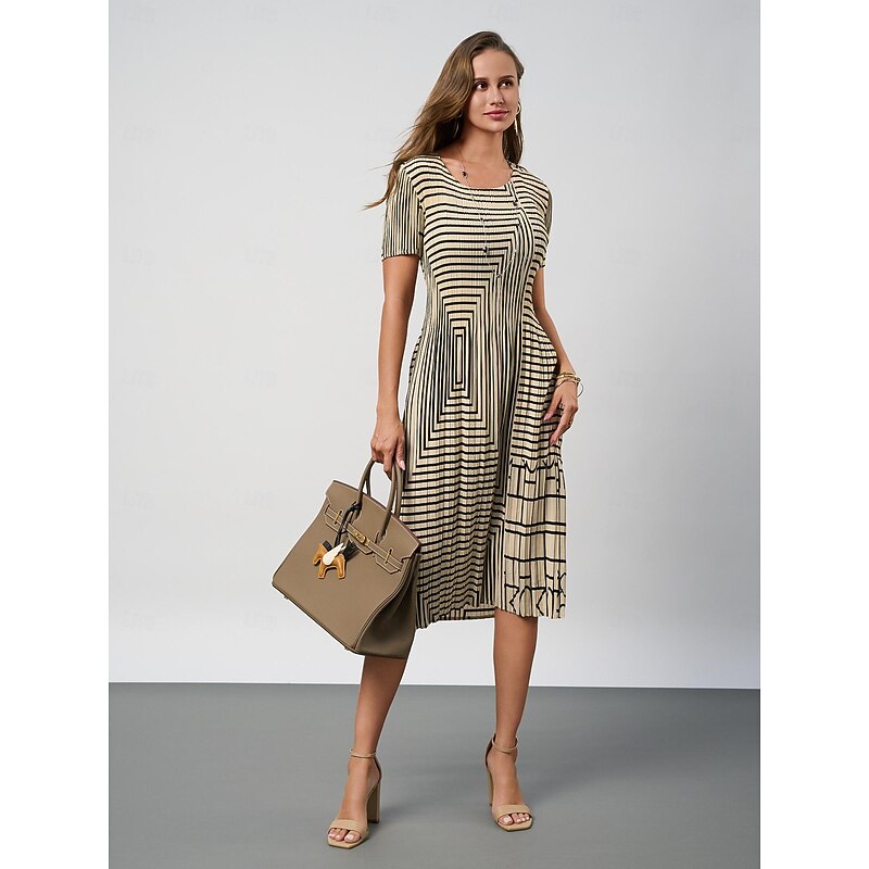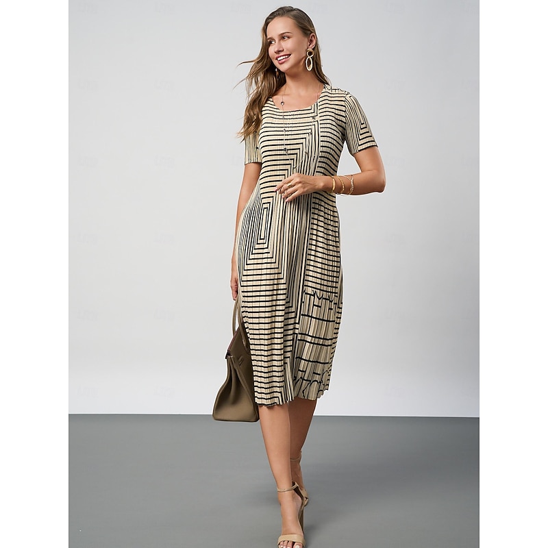 Women's Geometric Pleated Stripe Crew Neck Midi Dress Summer Spring