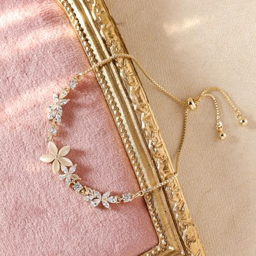 HOT ! Dainty Gold Flower Bracelets for Women, Trendy Sparkly Adjustable Non Tarnish Box Chain Opal Marquise Rhinestone Slider Bracelet Spring Prom Holiday Jewelry Gift