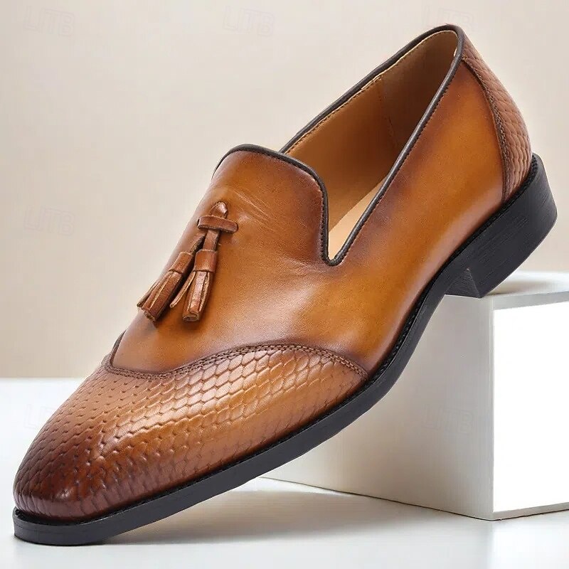 HOT ! Men's Tan Leather Loafers with Snake-Print Detailing and Tassel Accent – Premium Cowhide Slip-On Dress Shoes for Business, Formal Occasions, and Everyday Wear