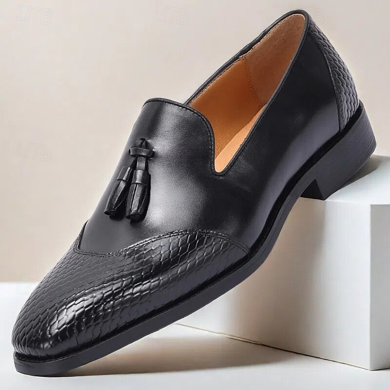 More information about Men's Tan Leather Loafers with Snake-Print Detailing and Tassel Accent – Premium Cowhide Slip-On Dress Shoes for Business, Formal Occasions, and Everyday Wear