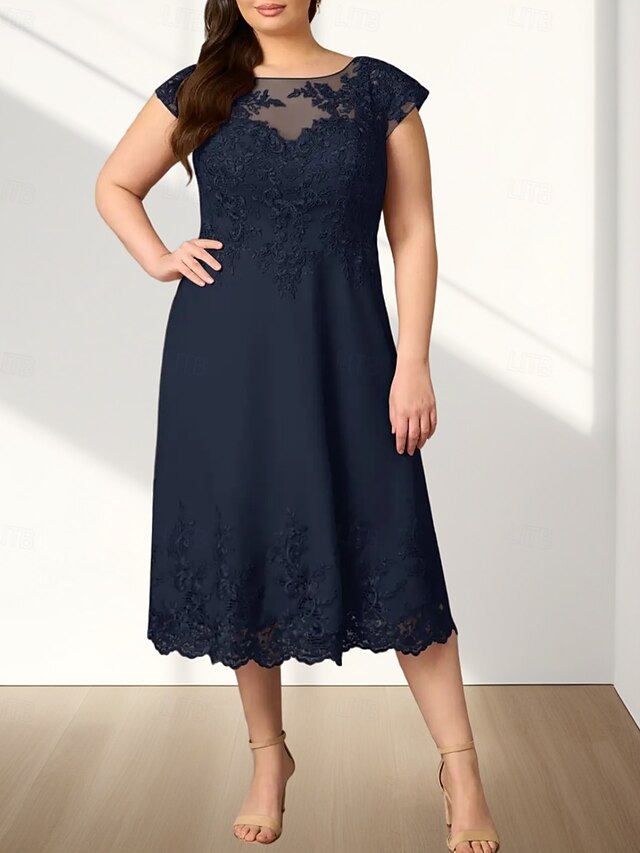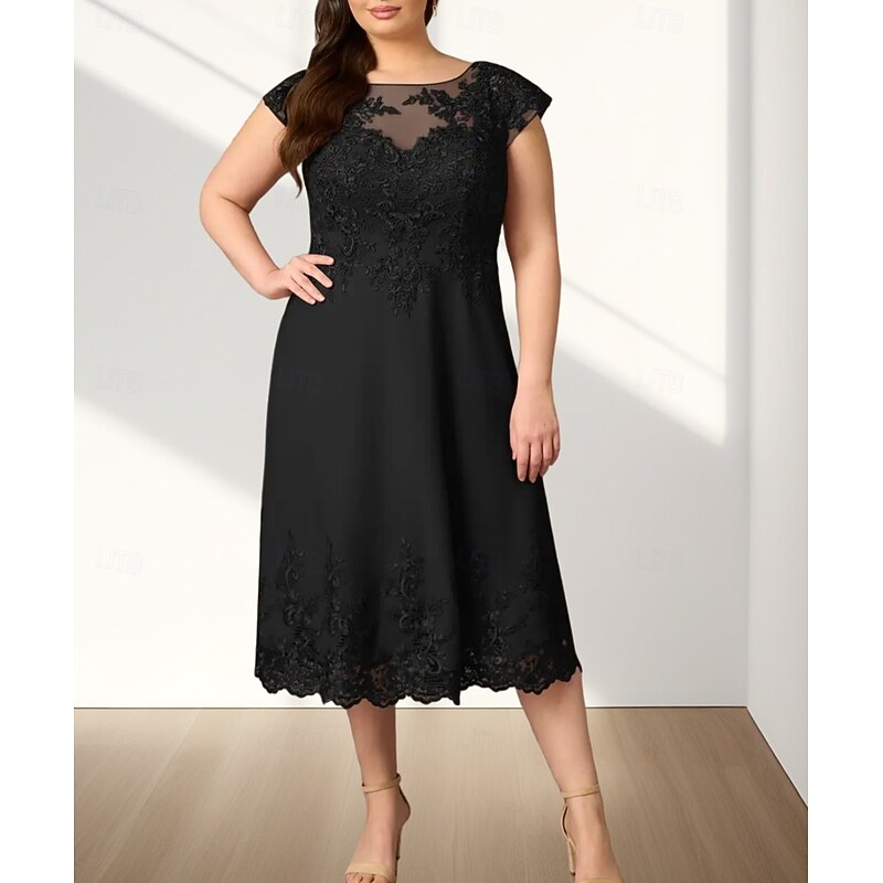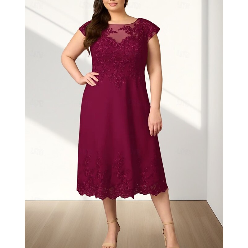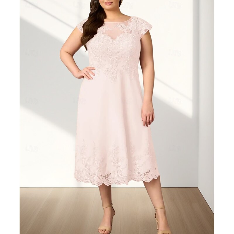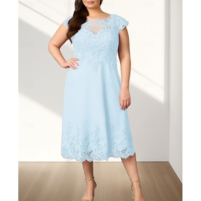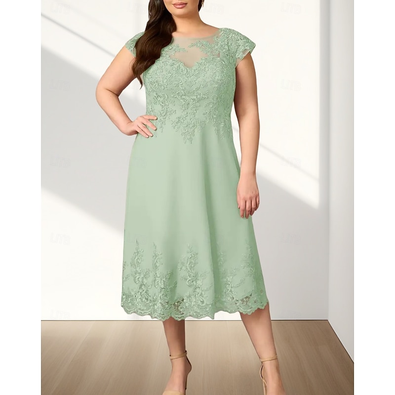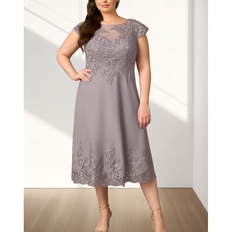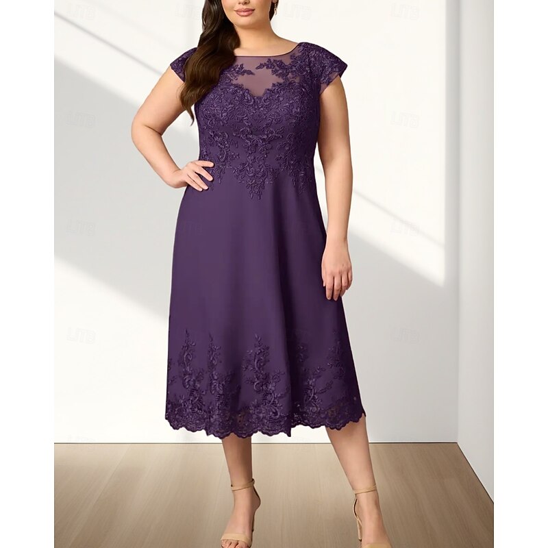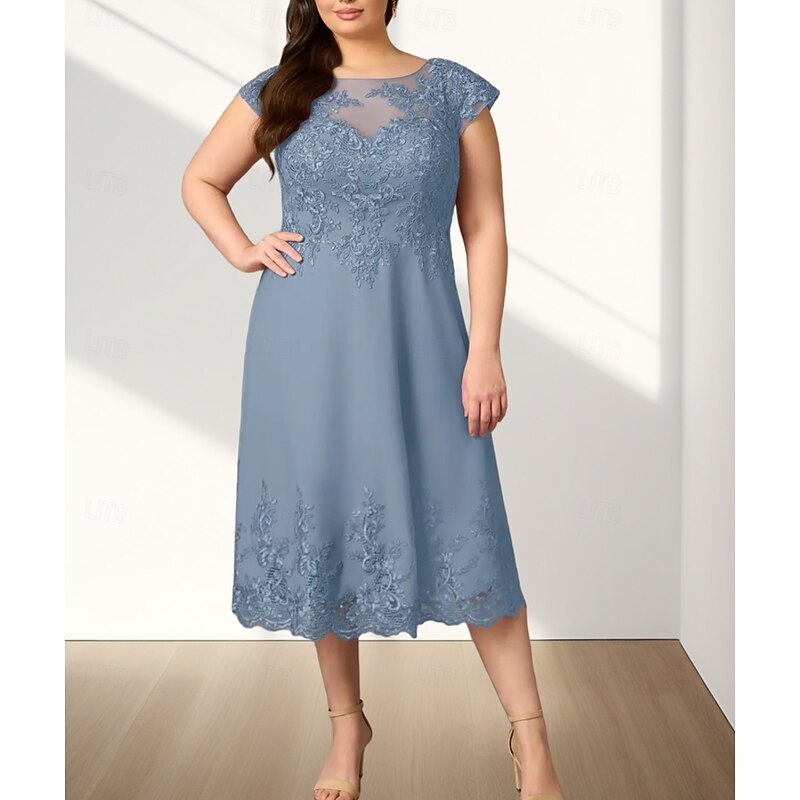 HOT ! A-Line Mother of the Bride Dress Wedding Guest Elegant Crew Neck Tea Length Chiffon Short Sleeve with Appliques Midi Dress