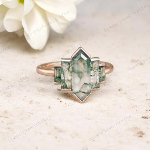 Natural Hexagon Cut Moss Agate Ring 14K Rose Gold Promise Ring April Birthstone Gift Art Deco Baguette Bridal Jewelry For Women BY COSMICJEWELCRAFTS 2