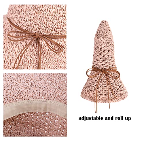 Women Wide Brim Straw Hat Floppy Summer Beach Bucket with Bowknot Adjustable Outdoor Sun Cap Foldable UV Protection Headwear 4