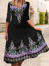 Highlights [Fabric:] Crafted from lightweight polyester, this dress offers a soft touch and micro-elasticity for a comfortable and breathable wear, perfect for the fall season. [Silhouette:] The dress boasts a flattering A-line silhouette that gently flows to a midi length, while the added swing design delivers an effortless yet stylish look suitable for daily wear. [Design Highlights:] Featuring a split neckline with button detailing, this dress captures attention with its vibrant floral and geometric prints. The three-quarter length sleeves and intricate bohemian patterns add a touch of elegance and artistry. [Occasions:] Ideal for vacations, casual daily outings, and semi-formal events, this versatile dress seamlessly transitions from relaxed gatherings to more polished settings, ensuring you always look effortlessly chic. [Size Range:] Available in a wide range of sizes including S, M, L, XL, 2XL, and 3XL, this dress offers a regular fit that accommodates various body types.