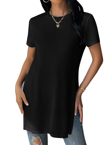 Remidoo Side Slit Tees for Women Tunic Tops Crewneck Long T Shirt Loose Fit Short Sleeve Tee 5