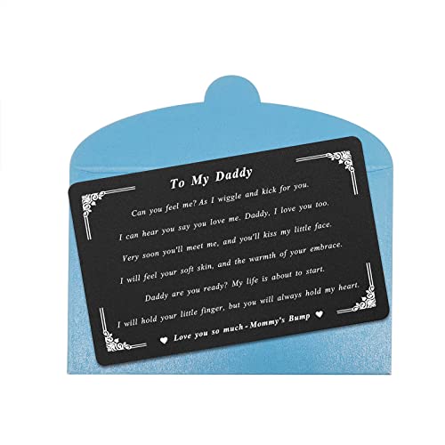 First Fathers Day New Dad - New dad gifts, father to be gifts, my daddy metal card, new dad gifts for men for father's day, Christmas, Valentines, birthday, new year etcPregnant Gifts - Pregnant gifts for new daddy, dad to be gifts, pregnant dad gifts, personalized gifts new dad wallet card with love notesNew dad metal card engraved with: To my daddy. Can you feel me? As I wiggle and kick for you. I can hear you say you love me. Daddy, I love you too. Very soon you'll meet me, and you'll kiss my little face. I will feel your silky skin, and the warmth of your embrace. Daddy are you ready? My life is about to start. I will hold your little finger, but you will always hold my heart. Love you so much - Mommy's BumpMatte Material - This my daddy card keepsake is made of aluminium alloy metal, sturdy and lightweight, will not bend easily within wallet! Permanent Laser Engraved, will not fade or wear offPerfect Measurement - Approximately credit card sized 3.35 x 2.13 x 0.03 inches, fits perfectly in any wallet. Envelope included Perfect for everyday use. top-grade materials and excellent craftsmanship ensure long-lasting durability.