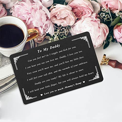 • New dad metal card engraved with: To my daddy. Can you feel me? As I wiggle and kick for you. I can hear you say you love me. Daddy, I love you too. Very soon you'll meet me, and you'll kiss my little face. I will feel your soft skin, and the warmth of your embrace. Daddy are you ready? My life is about to start. I will hold your little finger, but you will always hold my heart. Love you so much - Mommy's Bump