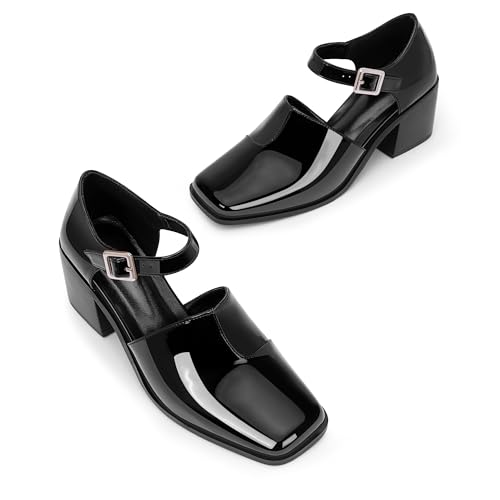 More information about 100FIXEO Women's Block High Heel Patent Leather Pumps Square Toe Buckle Strap Glossy Mary Jane Shoes