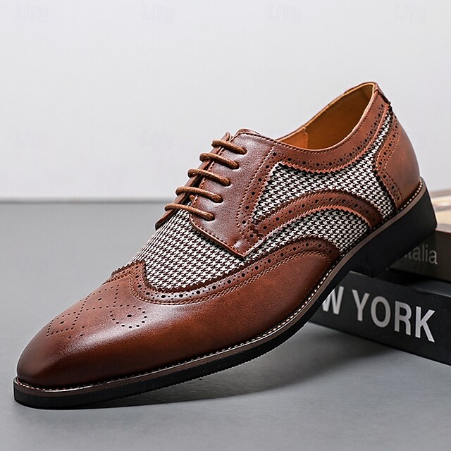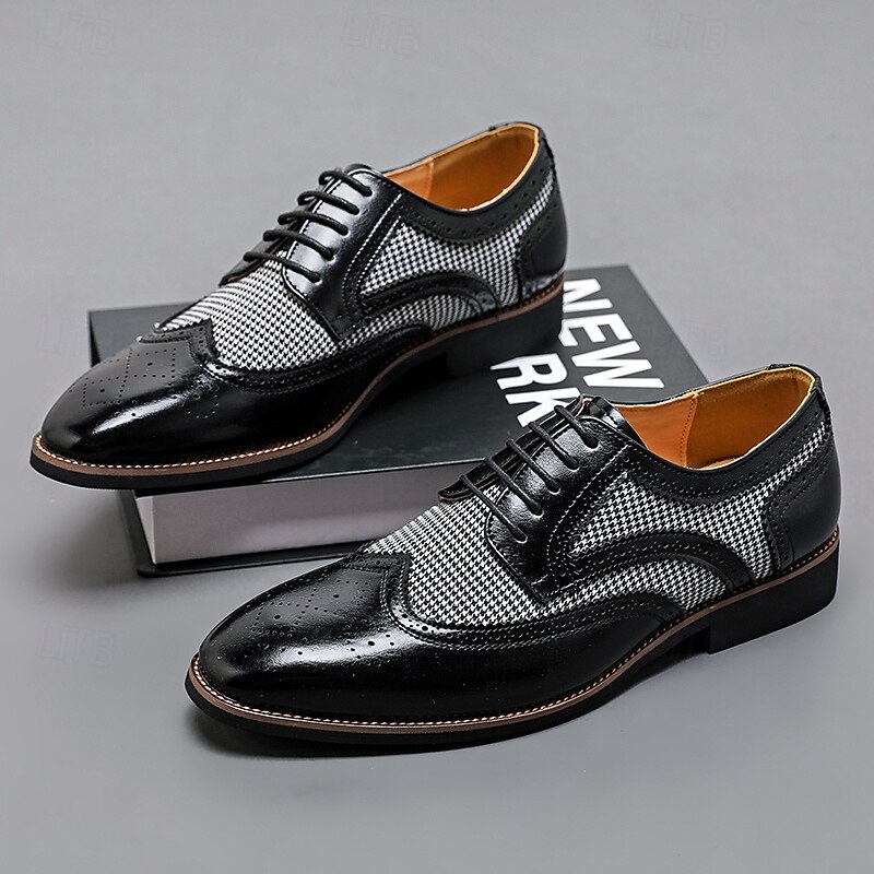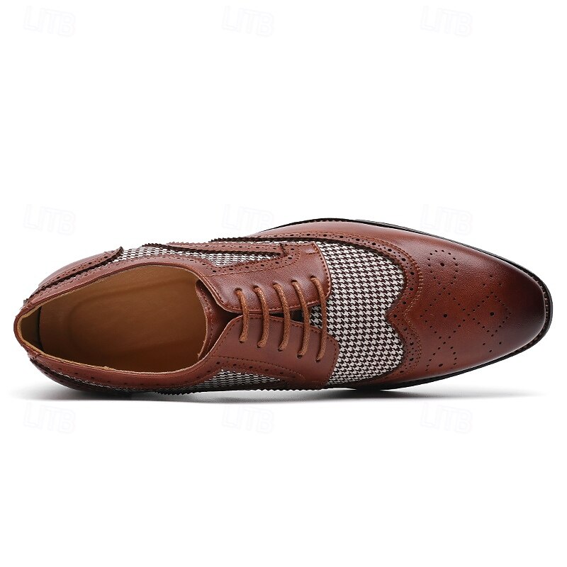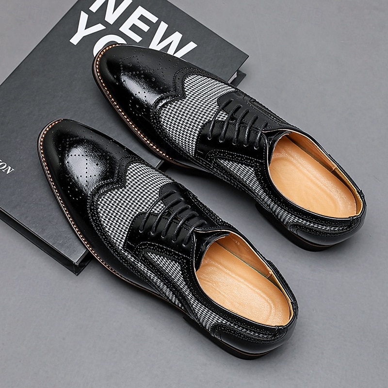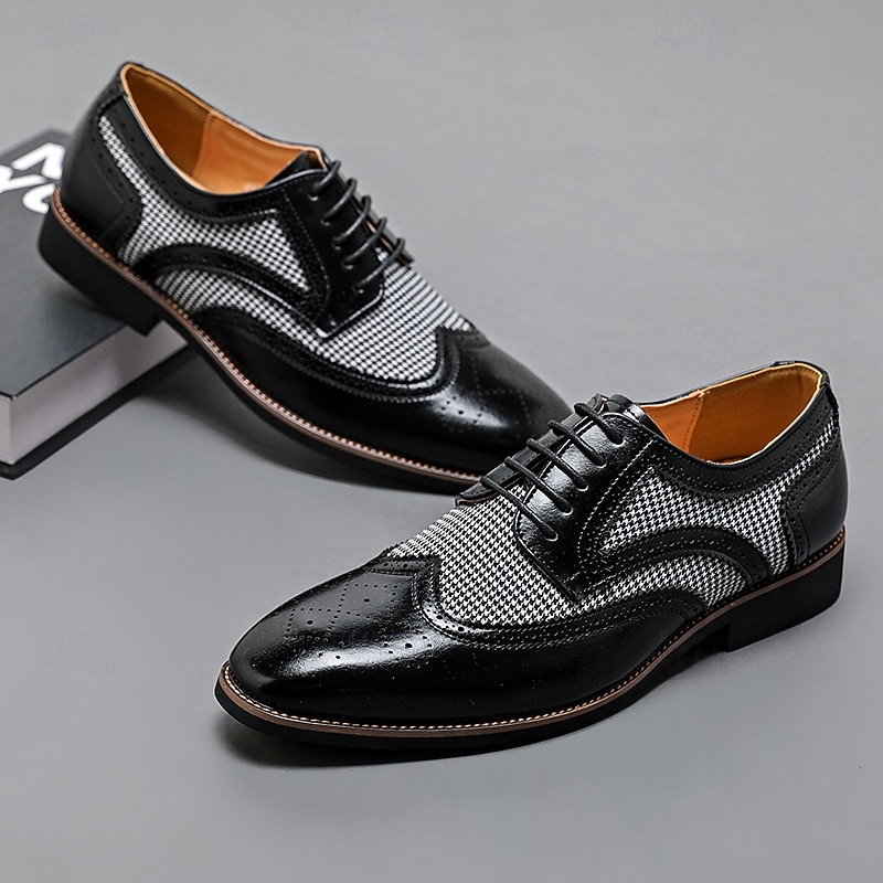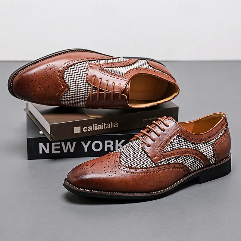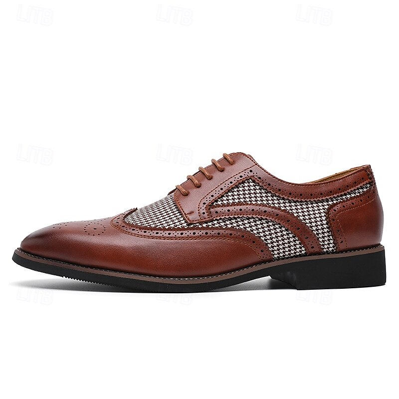 Highlights [Fabric and Materials] : These Men's Brown Faux Leather Oxford Shoes are crafted with a blend of PU leather and canvas, providing a perfect balance of durability and style. The lining is made from high-quality PU, ensuring comfort for long durations of wear. [Fit and Shape] : Designed with a classic round toe, these Oxfords offer a comfortable fit for everyday wear. The lace-up closure provides an adjustable and secure fit, enhancing comfort and ensuring the shoes remain in place during any event. [Design Highlights] : These shoes feature intricate brogue detailing with perforated edges, complemented by a striking houndstooth pattern on the side panels. This combination adds a sophisticated yet up-to-date twist to the traditional brogue design, making the shoes a standout piece in any wardrobe. [Occasions] : Ideal for business meetings, weddings, and other formal occasions, these shoes provide a polished and elegant look suitable for various events. They are perfect for those who appreciate a blend of classic and contemporary styles. [Size Range] : Available in a wide range of sizes, from US7 to US12, these shoes cater to various foot sizes, ensuring a precise and comfortable fit for all. Perfect for everyday use. excellent materials and excellent craftsmanship ensure long-lasting durability.