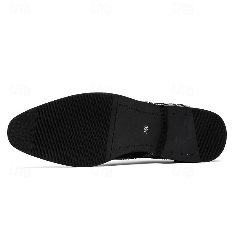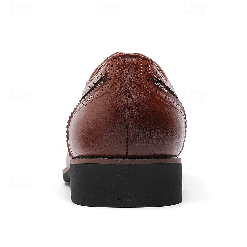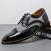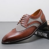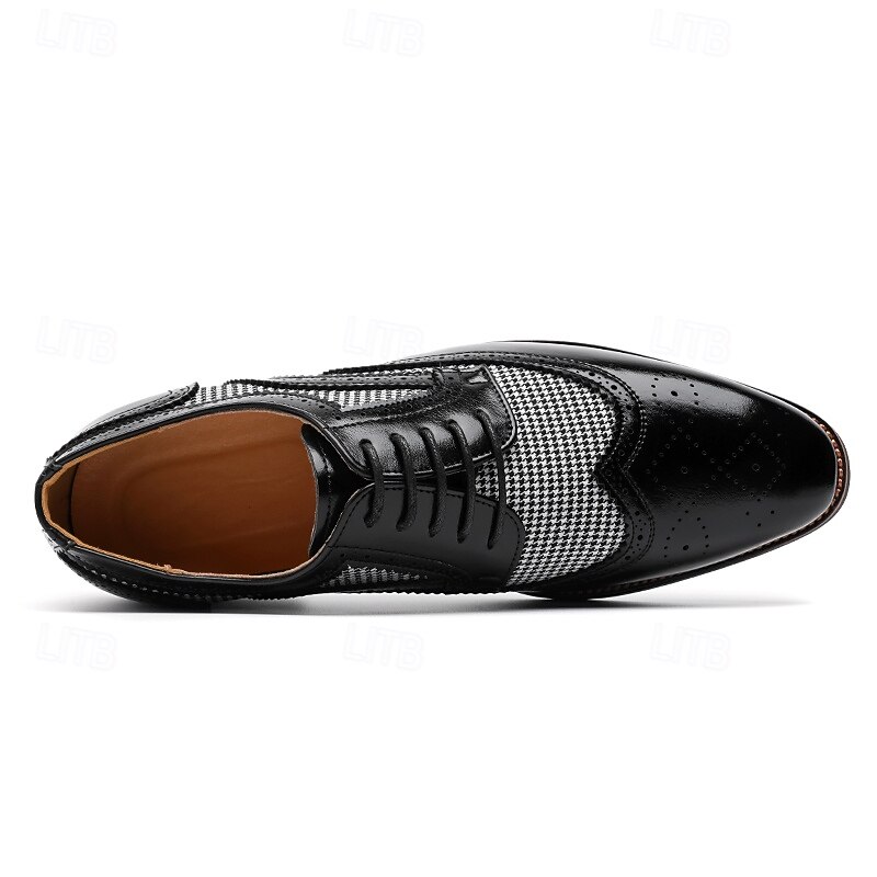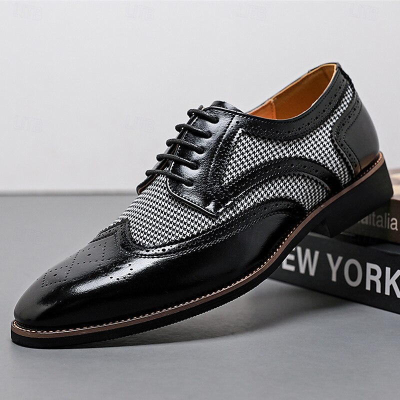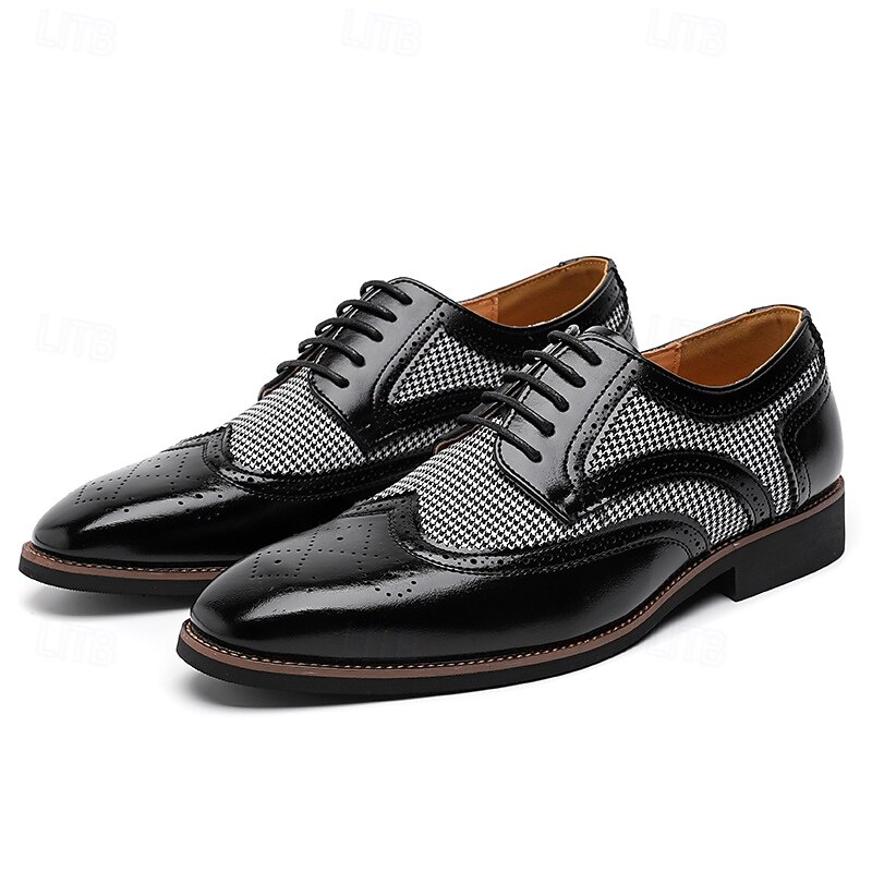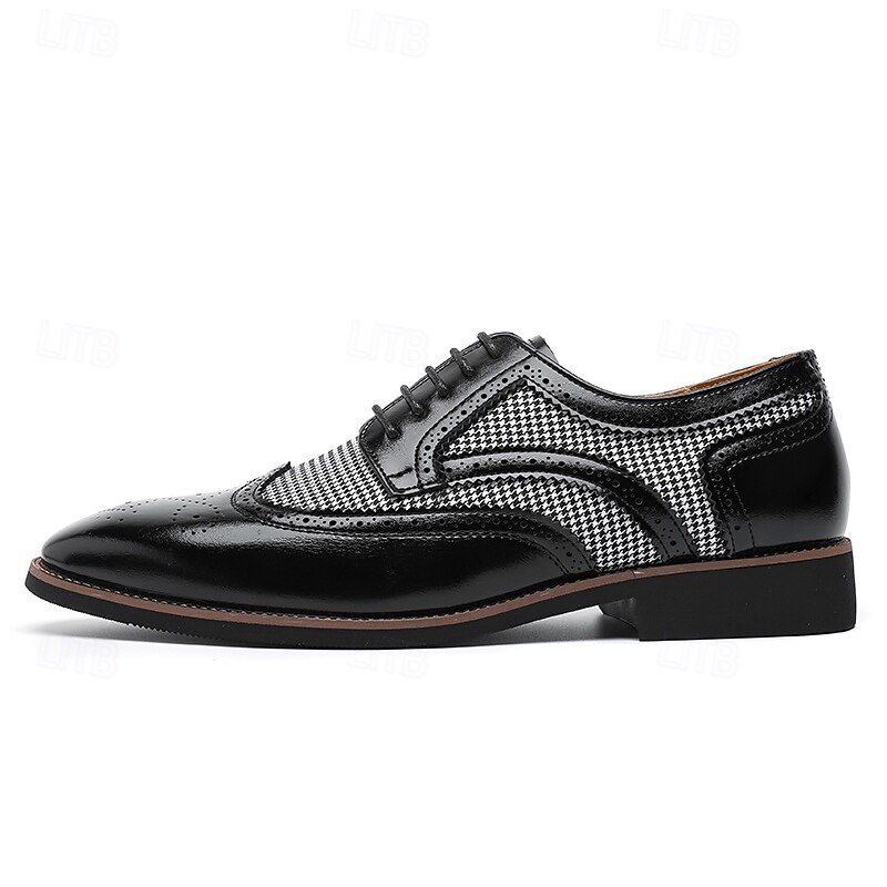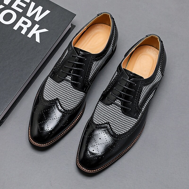 Highlights [Fabric and Materials] : These Men's Brown Faux Leather Oxford Shoes are crafted with a blend of PU leather and canvas, providing a perfect balance of durability and style. The lining is made from high-quality PU, ensuring comfort for long durations of wear. [Fit and Shape] : Designed with a classic round toe, these Oxfords offer a comfortable fit for everyday wear. The lace-up closure provides an adjustable and secure fit, enhancing comfort and ensuring the shoes remain in place during any event. [Design Highlights] : These shoes feature intricate brogue detailing with perforated edges, complemented by a striking houndstooth pattern on the side panels. This combination adds a sophisticated yet up-to-date twist to the traditional brogue design, making the shoes a standout piece in any wardrobe. [Occasions] : Ideal for business meetings, weddings, and other formal occasions, these shoes provide a polished and elegant look suitable for various events. They are perfect for those who appreciate a blend of classic and contemporary styles. [Size Range] : Available in a wide range of sizes, from US7 to US12, these shoes cater to various foot sizes, ensuring a precise and comfortable fit for all. Perfect for everyday use. excellent materials and excellent craftsmanship ensure long-lasting durability.