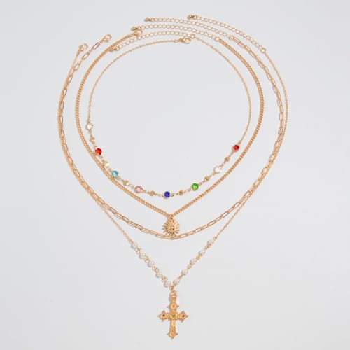 Cross Necklace for Women Gold Long Chain Layered Crystal Cross Pendant Statement Necklace Summer Beach Boho Jewelry 7