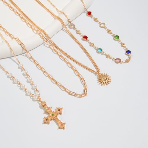Cross Necklace for Women Gold Long Chain Layered Crystal Cross Pendant Statement Necklace Summer Beach Boho Jewelry