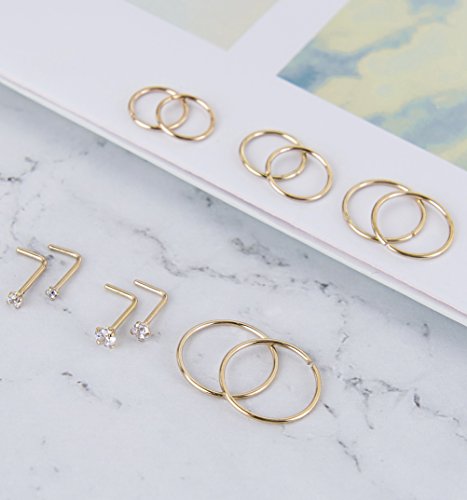 • SUITABLE SIZE: 20 Gauge=0.8 mm, 8 pcs bendable nose hoop rings, 6-12 mm diameter; 4 pcs l-shaped nose studs, wearable length=7 mm, suitable size to wear as nose ring, lip ring ,helix earrings ,cartilage ring, tragus ear piercing,earrings and septum ring