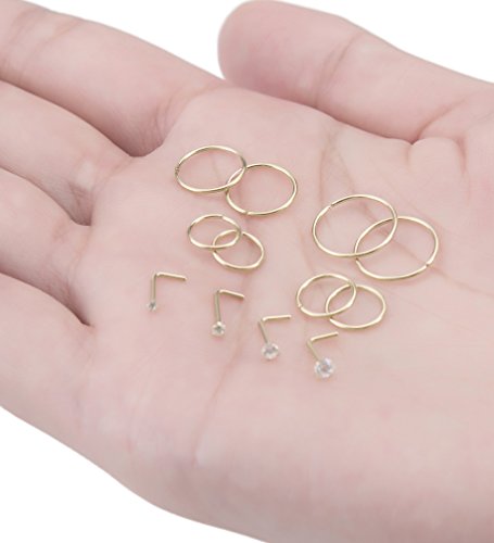 • AFFORDABLE NOSE RING SET: Come with 8 pcs Nose Hoop Rings(6 mm-2 pcs, 8 mm-2 pcs, 10 mm-2 pcs, 12 mm-2 pcs) and 4 pcs nose studs(1.5/2/2.5/3 mm cz), 16 pcs nose piercing, also perfectly as ear/tragus/helix/cartilage/nose/lip ring, give you different choices wearing