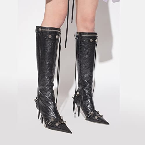 More information about Goolita Women's Pointed Toe Rivet Knee High Boots Stiletto High Heel Punk Style Boot Thin Tassels Buckle Long Bootie