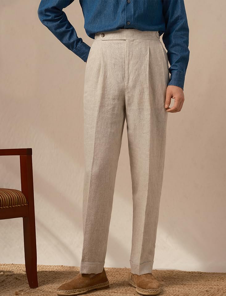 Men's Retro Linen Gurkha Trousers Lightweight Tapered Leg Flat Front Chino Pant Summer Pants 4