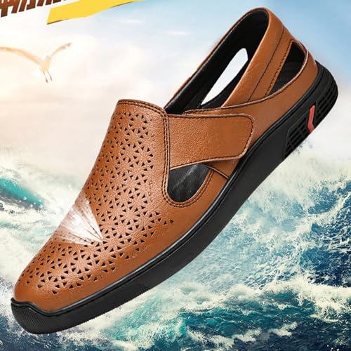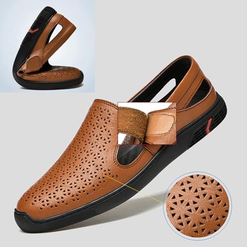 Men's Genuine Leather Hollow Flat Loafers Closed Round Toe Slip On Casual Sandals Summer Outdoor Breathable Anti-Slip Walking Shoes 6