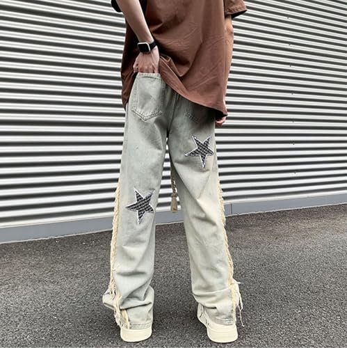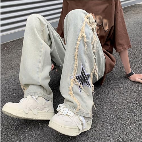 HOT ! jupkem Men's Baggy Straight-Leg Jeans Y2K Star Print Wide-Leg Retro Distressed Grunge Pants Casual Fashion Streetwear