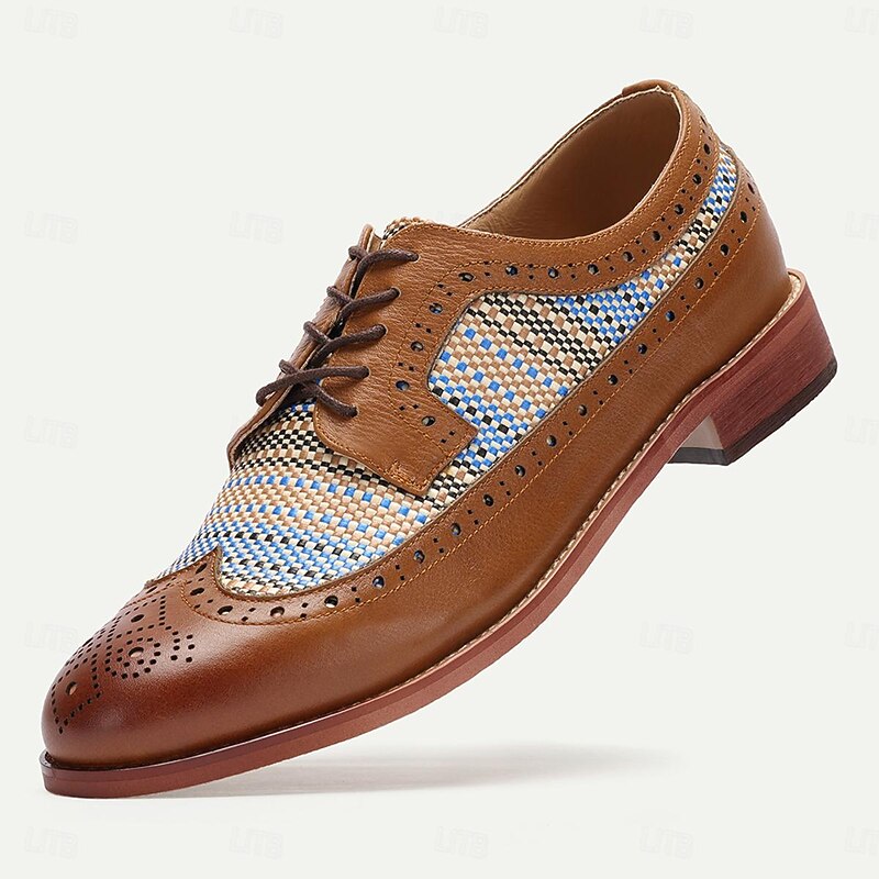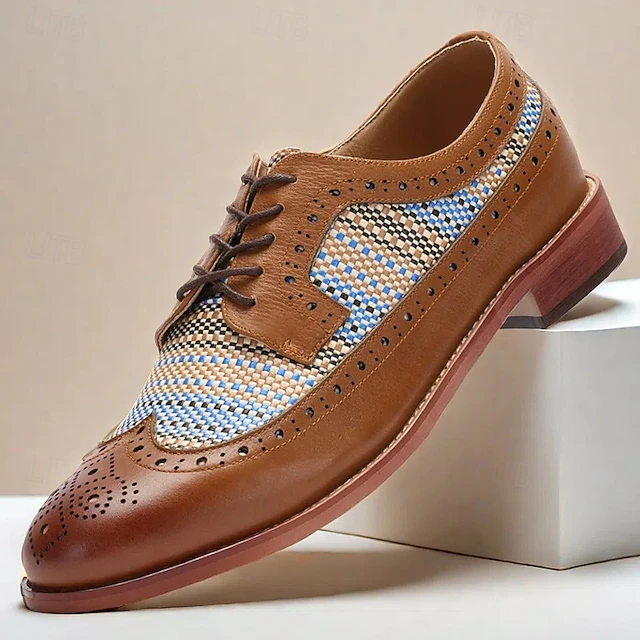 HOT ! Men's Tan Faux Leather Brogue Oxfords with Blue Nylon Woven Insets - Business Casual Wear