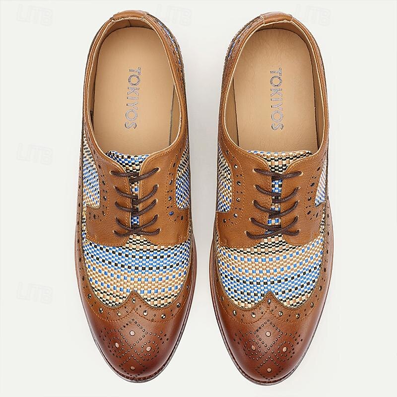 Men's Tan Faux Leather Brogue Oxfords with Blue Nylon Woven Insets - Business Casual Wear 8