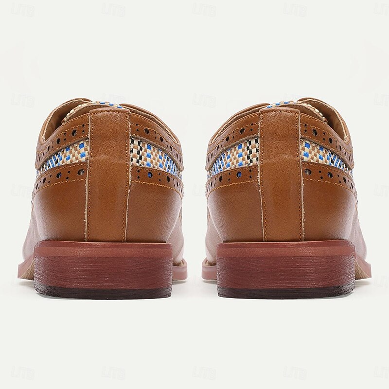 Men's Tan Faux Leather Brogue Oxfords with Blue Nylon Woven Insets - Business Casual Wear 11