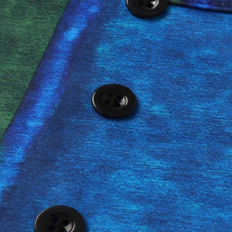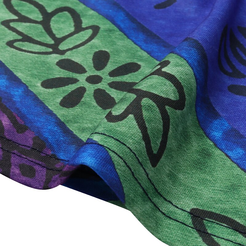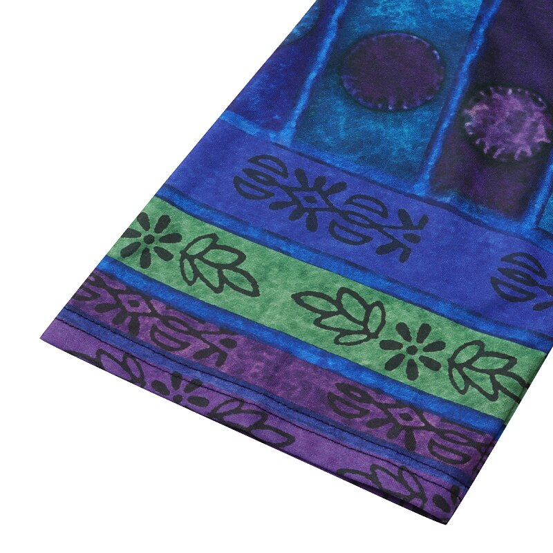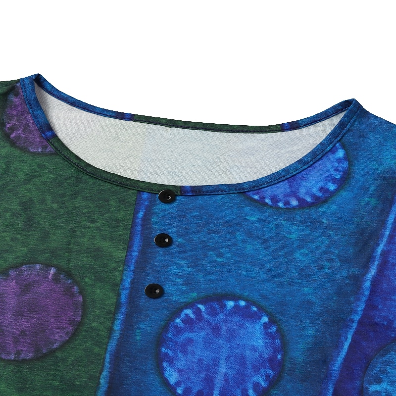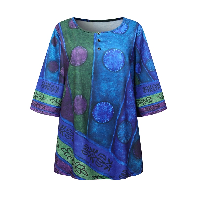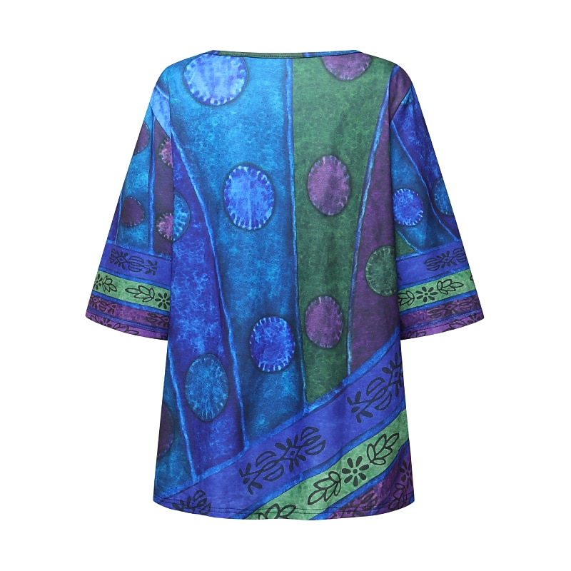 Showcasing a bohemian flair, this top features a vibrant color block and striped print, adding a touch of eclectic charm. The crew neckline is adorned with playful decorative buttons, and the fabric's vivid patterns contribute to a chic, laid-back style.
