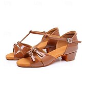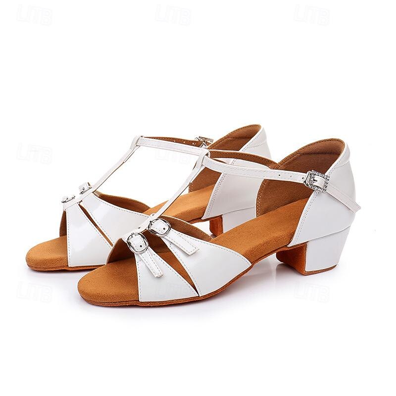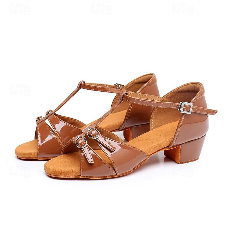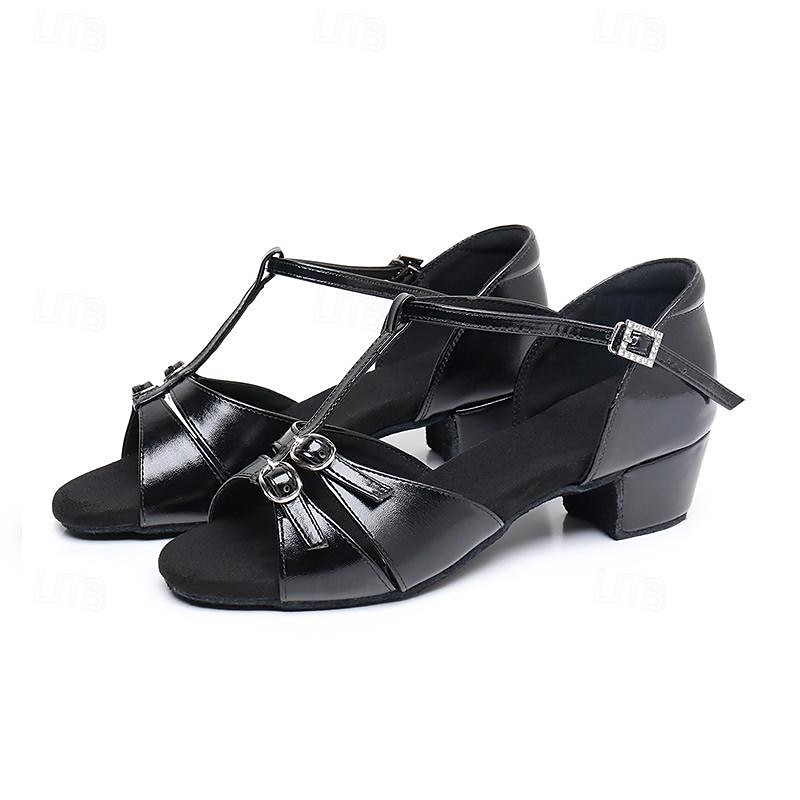 Highlights [Fabric] : Crafted with premium PU leather, these women's Latin dance shoes are designed for durability and elegance, complemented by a suede outsole for smooth movement across the dance floor. [Fit] : Featuring a stylish sandal design, these shoes ensure a perfect balance between elegance and support, making them ideal for both professional performances and practice sessions. The T-strap and ankle strap with buckle closures provide a secure and adjustable fit, ensuring stability and confidence during your routines. [Design Highlights] : The shoes boast a chic open-toe look with a thick block heel that adds stability and comfort, crucial for extended wear. The shimmering synthetic material captures the light beautifully, enhancing the visual appeal whether on stage or at a dance event. [Occasions] : Perfect for Latin dance performances, training, and practice, these sandals are versatile enough for both professional and amateur dancers wanting to add a touch of glamour to their dance wardrobe. [Size Range] : Available in multiple sizes from US1.5 to US9, these shoes cater to a wide range of foot sizes, ensuring that every dancer finds her perfect fit. The selection of colors, including Silver, Dark Brown, and Black, among others, provides options to suit personal style and outfit coordination.