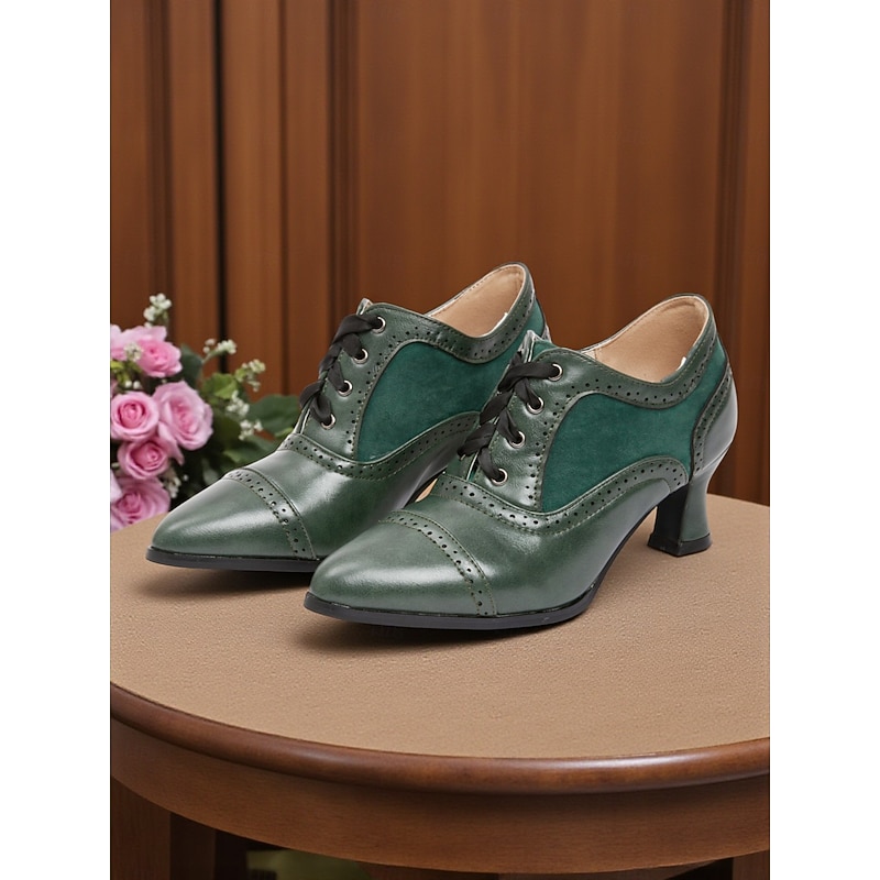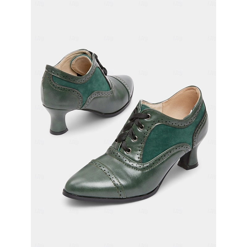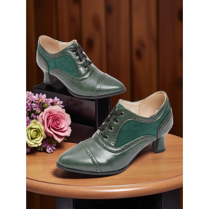 HOT ! Women's Edwardian Era Green Oxford Heels – 1900s-1910s Vintage Lace-Up Victorian Mid-Heel Dress Shoes with Brogue Detailing, Perfect for Tea Parties, Cosplay and Historical Events