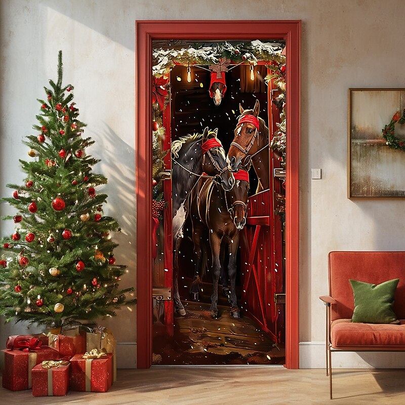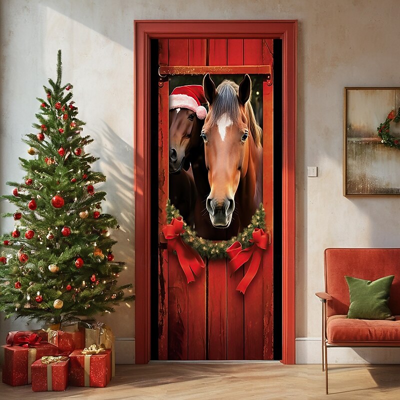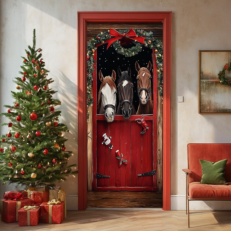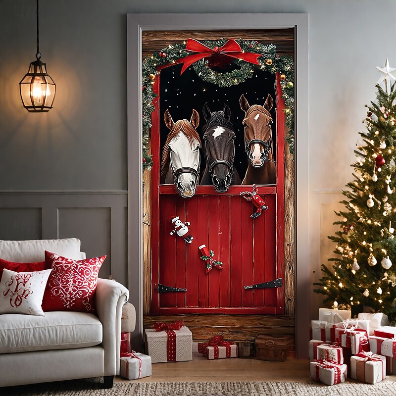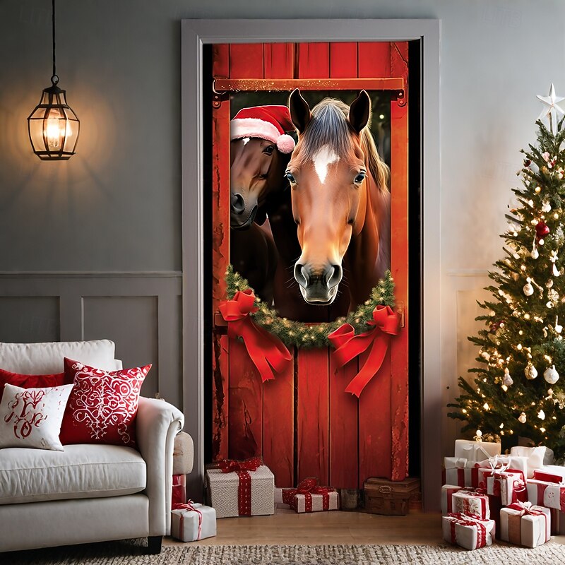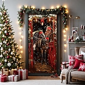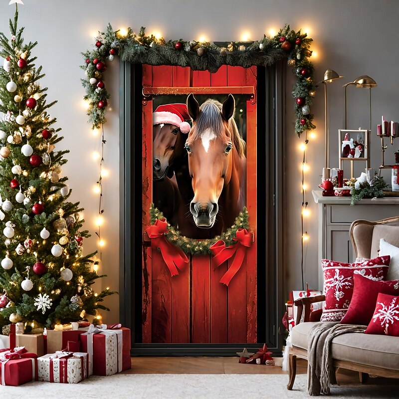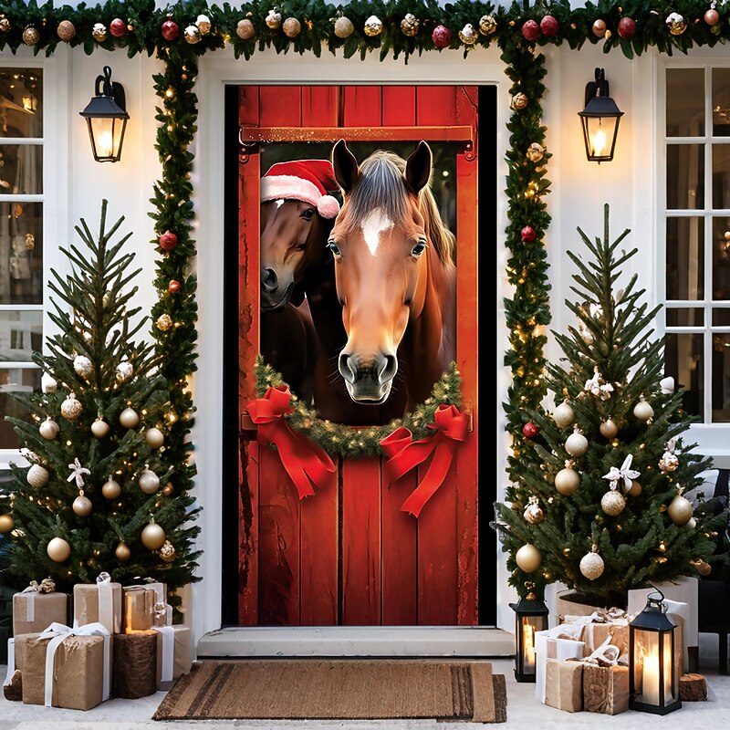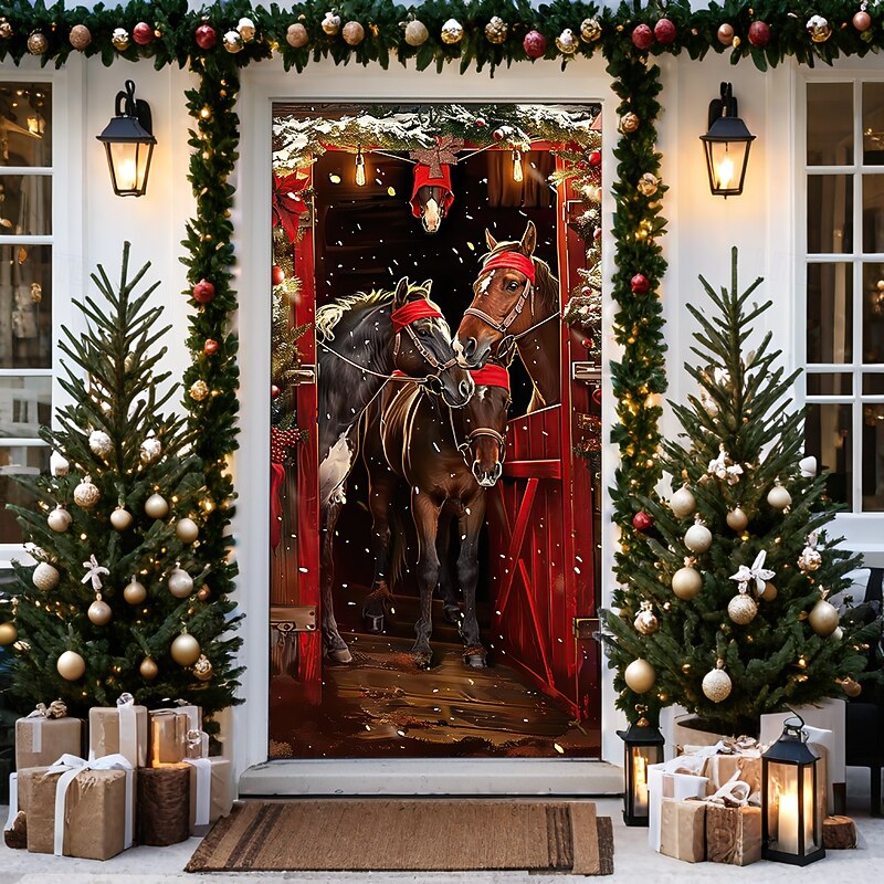 Christmas Door Decorations Door Covers Horses Door Tapestry Door Curtain Decoration Backdrop Door Banner for Front Door Farmhouse Holiday Party Decor Supplies Indoor/Outdoor