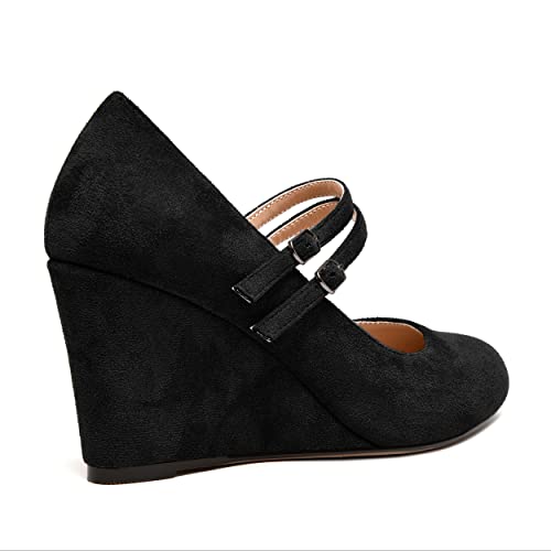 NUMALEO Womens Round Toe Suede Solid Buckle Ankle Strap Dress Business Wedge High Heel Pumps Shoes 3.3 Inch 6