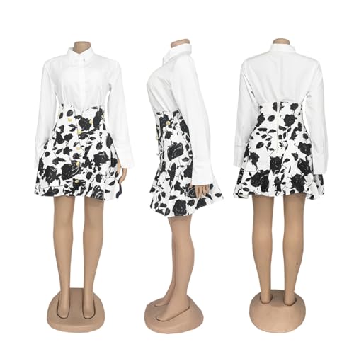 WOKANSE Festival Outfits for Women Lapel Button Down Long Sleeve Shirt Printed V Waist Puff Mini Skirt Suit 2
