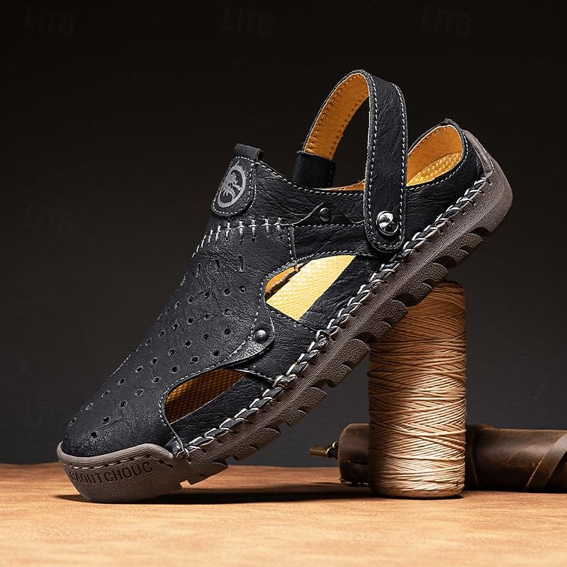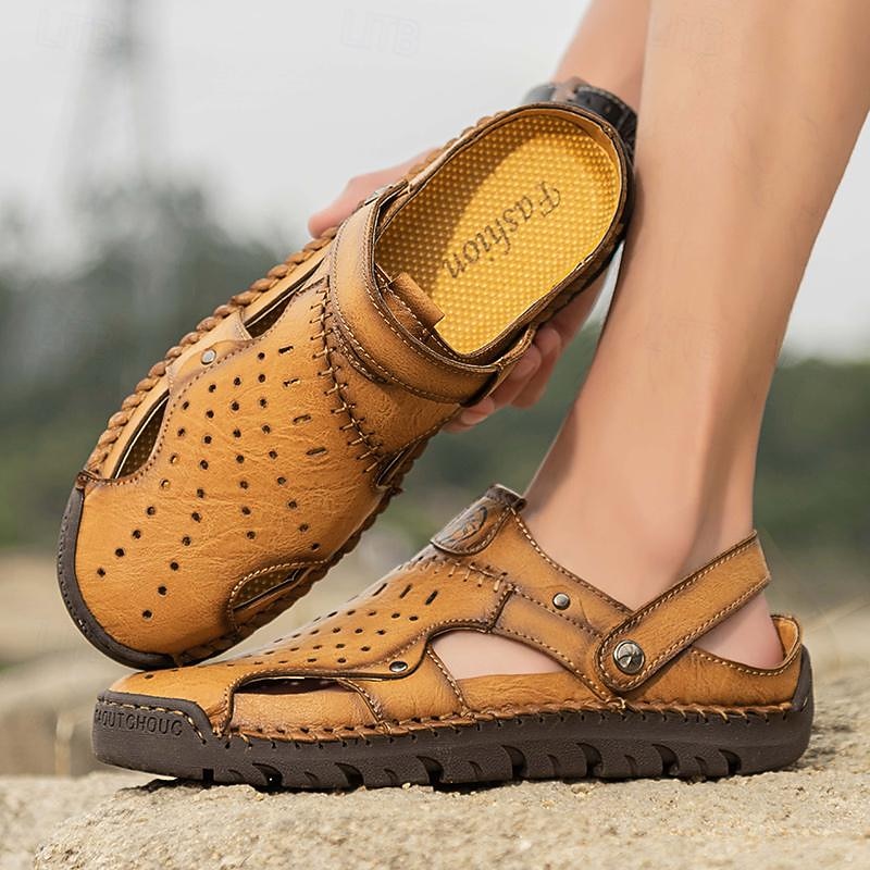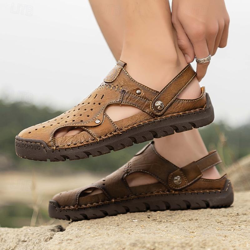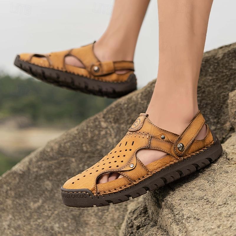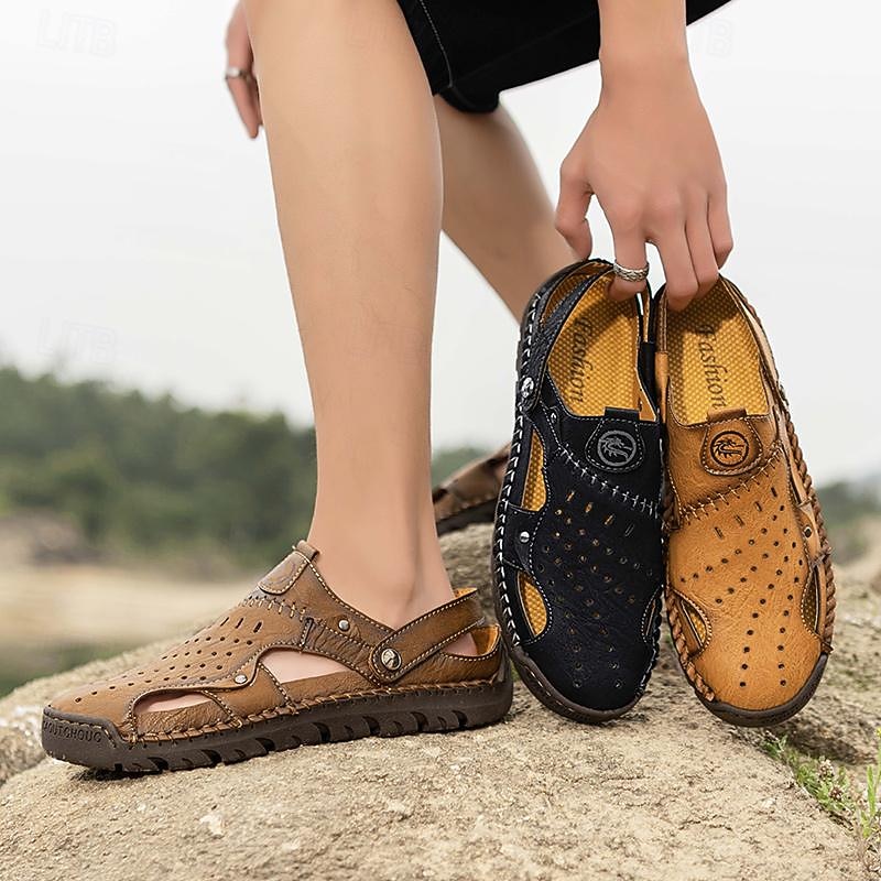 Highlights [Fabric] These men's leather sandals are expertly crafted from high-quality leather, offering a durable and comfortable experience. The soft and supple texture of the leather makes it ideal for long-term wear, ensuring both luxury and resilience. [Fit] Designed with a semi-open and slip-on style, these sandals provide a casual yet versatile fit. The adjustable ankle strap ensures a secure and customized experience, while the standard sizing allows for an usual size selection, providing comfort and practicality. [Design Highlights] Featuring a closed toe design, these handmade sandals boast ample perforation for excellent breathability. The rugged, slip-resistant rubber outsole enhances traction and stability across a variety of terrains, combining practicality with a timeless aesthetic. [Occasions] Perfect for a range of activities, from daily casual wear to outdoor adventures, these sandals seamlessly blend comfort with style. Whether heading to the beach or spending a day walking around town, their versatile design makes them a reliable choice for various occasions. [Size] Available in a comprehensive size range from US6-12 (EU38-45, UK5-11), ensuring a suitable fit for most menβs sizes. These sandals are crafted to accommodate a variety of foot shapes and preferences, making them a practical addition to any wardrobe. Perfect for everyday use. top-grade materials and excellent craftsmanship ensure long-lasting durability.