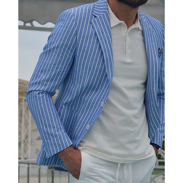Men's Graduation Blazer Business Cocktail Party Wedding Party Fashion Casual Spring Autumn / Fall Cotton Blend Stripes Pocket Buttons Comfortable Single Breasted Blazer Royal Blue 7