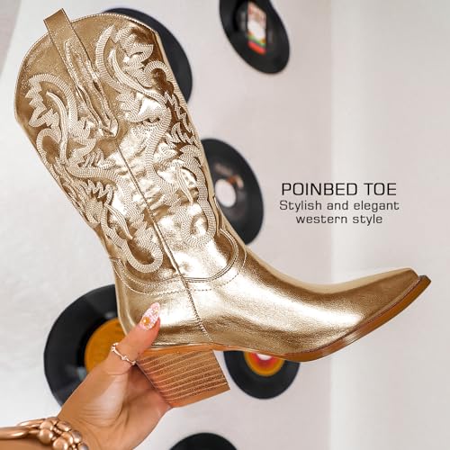 More information about Glitter Wide Calf Metallic Embroidered Cowboy Boots For Women Sparkly Mid Calf Chunky Heel Pull on Pointy Toe Western Cowgirl Boots Fashion Vintage Short Booteis For Girl