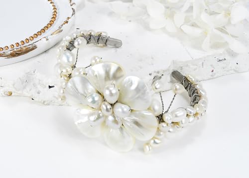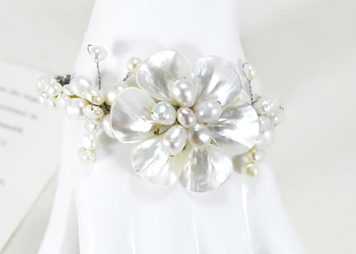 More information about AeraVida Ocean’s Iridescent Garden White Mother of Pearls Seashell and Cultured Freshwater Pearls Floral Cuff Bracelet | Open Cuff Bangle Bracelet for Women