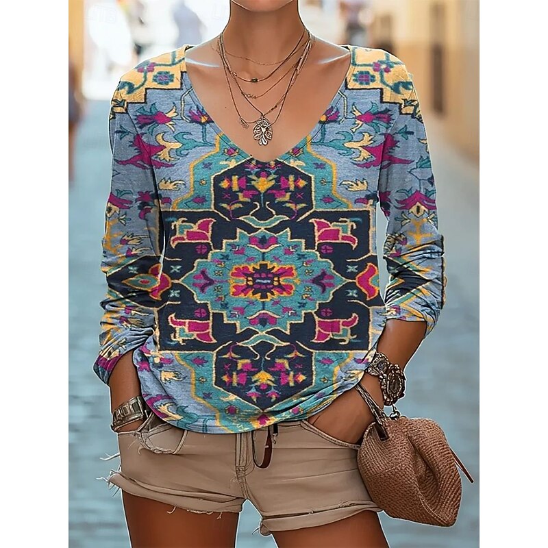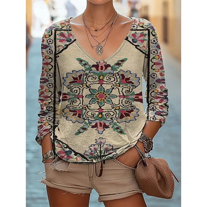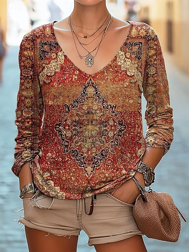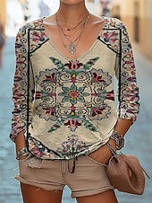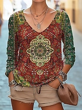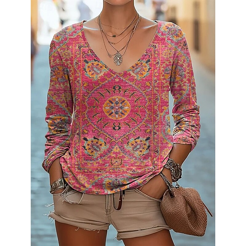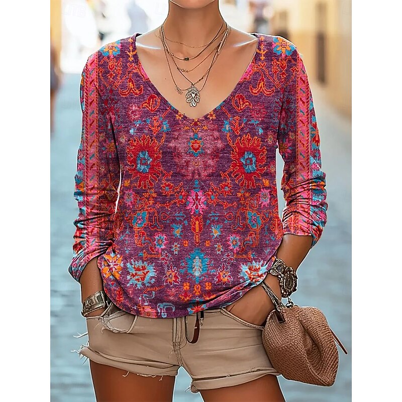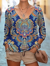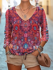 HOT ! Women's Blouse Floral Retro Vintage Ethnic Long Sleeve V Neck Regular Tops Daily Holiday Print Black Pink Wine Red Royal Blue Summer Spring Fall