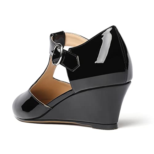 MODENCOCO Women's T Strap Patent Buckle Party Round Toe Fashion Wedge Low Heel Pumps Dress Shoes 2 Inch 6