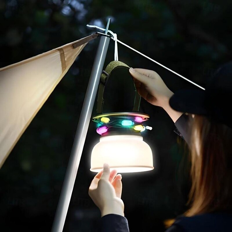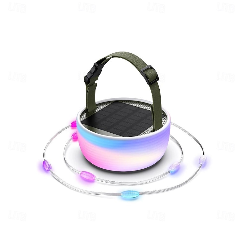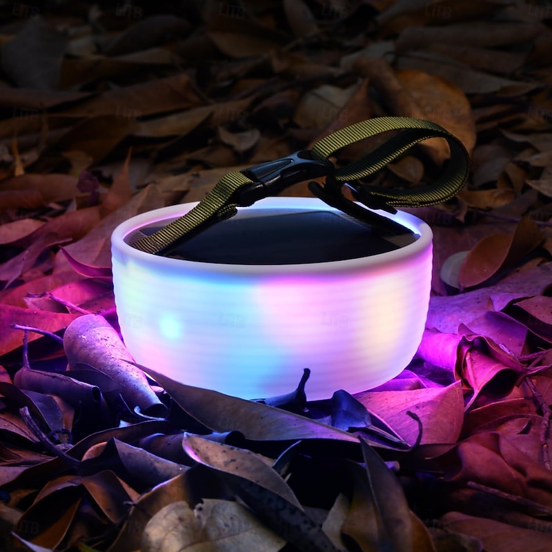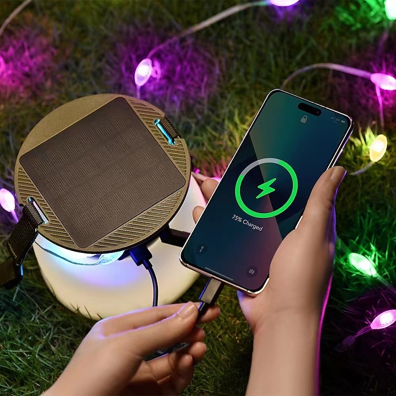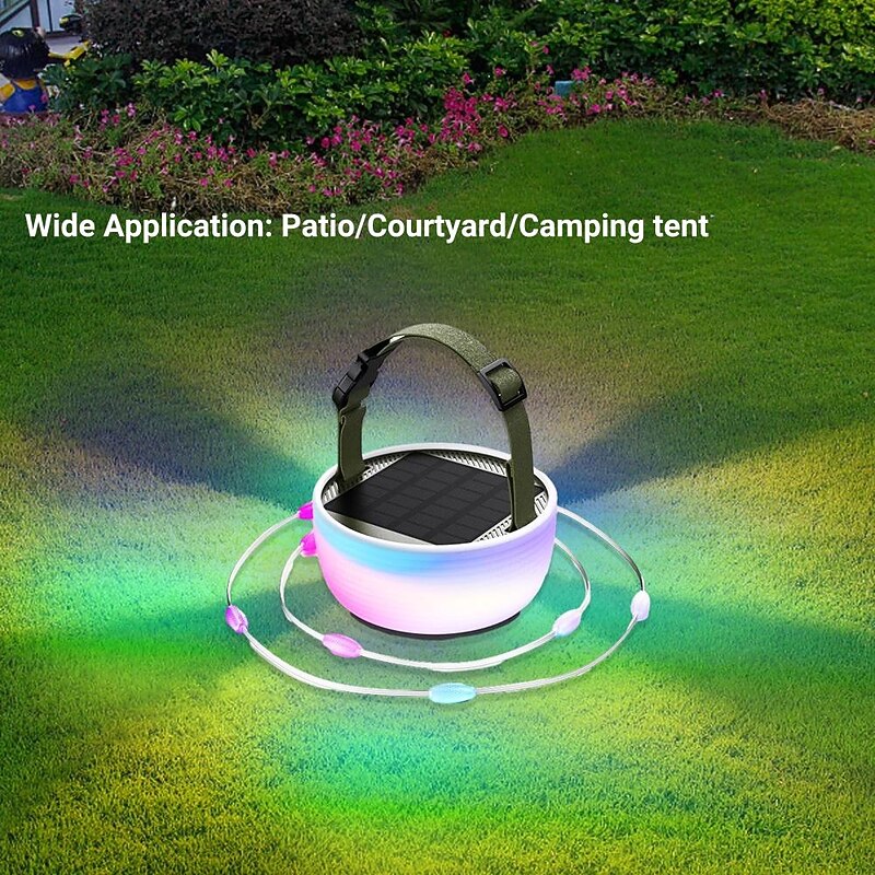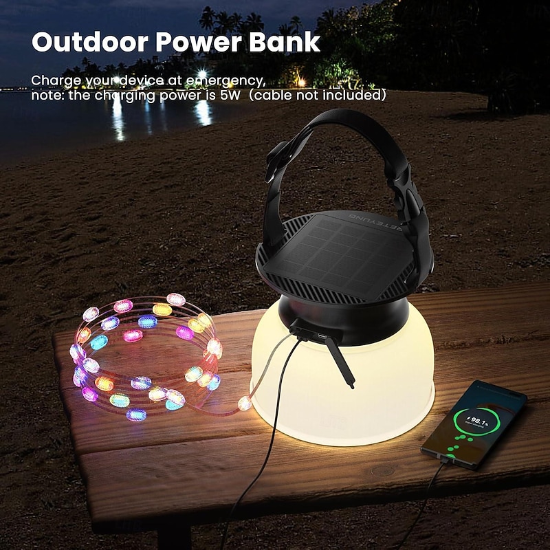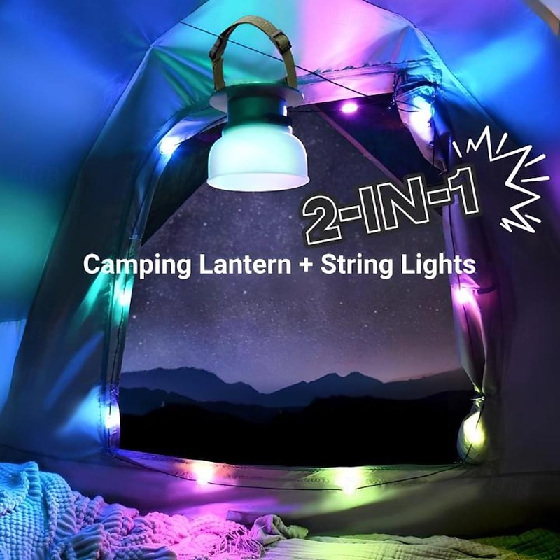 4 IN 1 SOLAR POWERED CAMPING STRING LIGHTS - This camping light combines 8 RGB color string lights, camping lights, solar power charging, and power bank functions. It is an essential tool for darkness, power outages, and emergency situations during camping and outdoor travel.