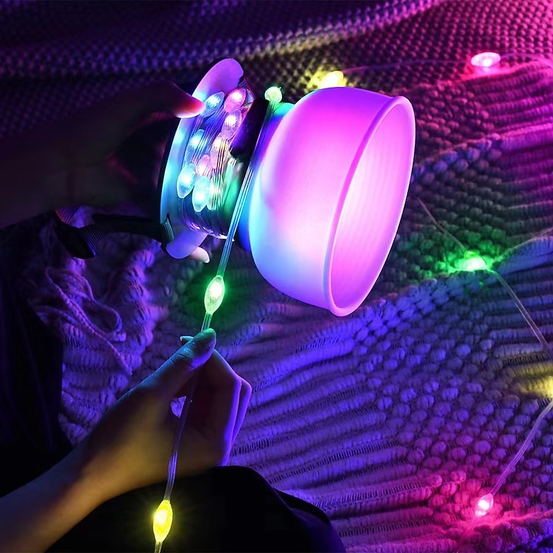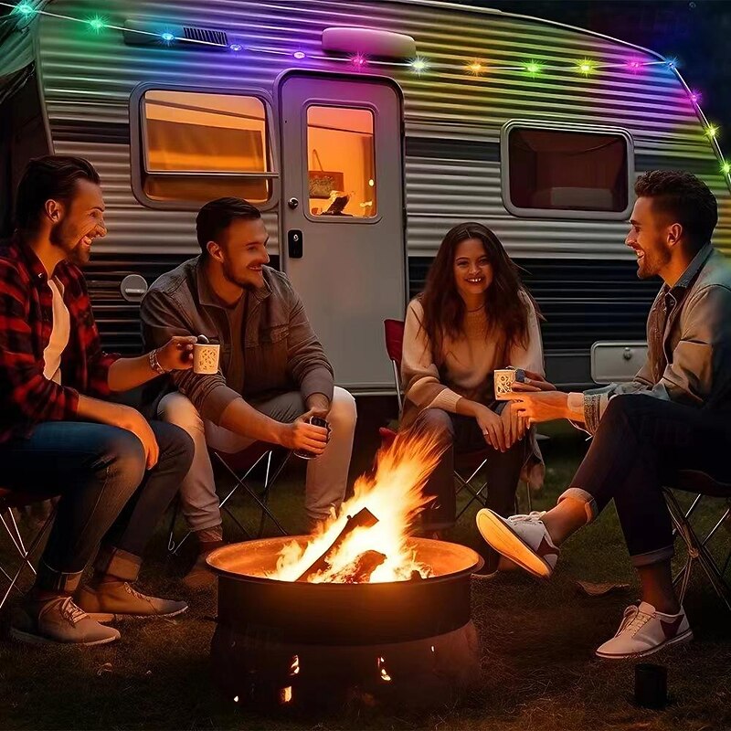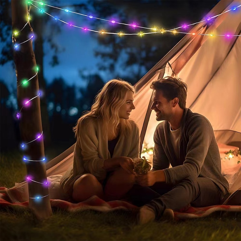 16.4FT RGB COLOR ATMOSPHERE STRING LIGHTS - Featuring 8 RGB color modes (flashing, breathing, steady), these string lights create a cozy and sweet atmosphere for lovers and campers. The 33 bulbs are a perfect decoration for gardens, camping, parties, outdoor hiking, travel, and holidays.