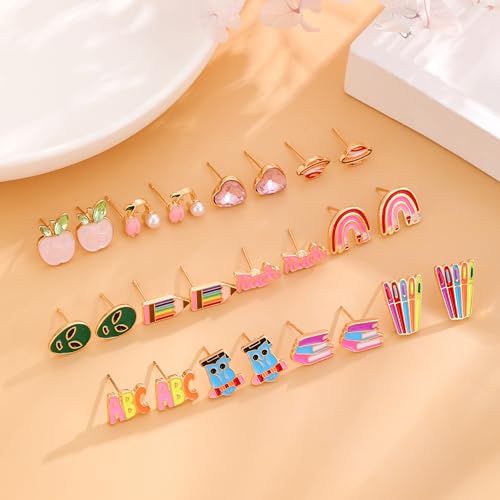 HOT ! 12 Pairs Teacher Stud Earrings for Women Back to School Earrings for Teens Girls Hypoallergenic Pencil Apple Book Earrings for Student Graduation Jewelry
