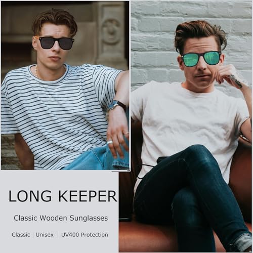 Long Keeper Wood Sunglasses for Men Women traditional Black Sunglasses Wooden Arms Mirrored Dark Shades 80's Retro Sun Glasses