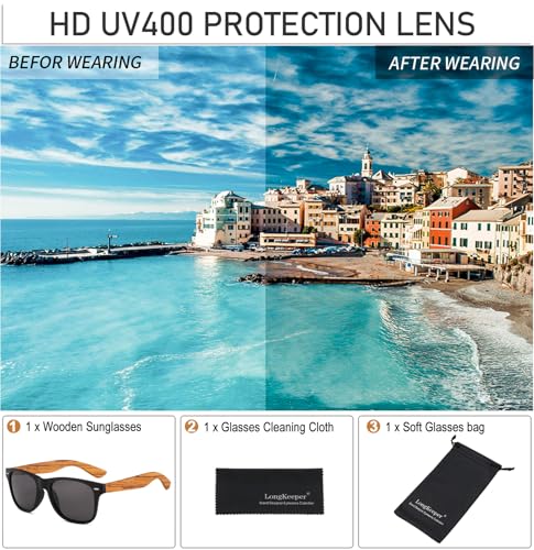 Origin: ImportedUV400 Protection: Anti-UV400 sunglasses will keeping your eyes healthy without strain, and blocking out 100% of all UVA, UVB. Long Keeper retro 80s wood sunglasses with UV400 protection coating lenses are essential to protect your eyes against long-term UV damage and keep your eyes healthy when out and about.Stand Out From The Crowd: Natural wood has a unique touch and beautiful texture, mother nature doesnβt make two pieces of wood the same. So, every Long Keeper wooden sunglasses is unique and only belongs to you. These nice wood sunglasses, fit for all face shapes, great gifts for family, lover, friend when Christmas, Valentine's Day, Birthday, Father's Day, Graduation Ceremony Etc.Comfortable Eyewear: These retro square sunglasses are made of lightweight plastic frame with nice wood temple, smooth curved arm, integrated nose pads and reinforced metal hinges; UV400 protection lenses that can block 100% of both UVA and UVB radiation and make you look irresistible at the same time. All the details ensure you a long time using and provide you a high level wearing experience.Product Dimension - Lens height: 1.57 inches (40mm), Lens width: 1.97 inches (50mm), Nose bridge width: 0.79 inches (20mm), Frame Height: 1.77 inches (45mm), Frame Width: 2.17 inches (55mm), Total Frame width: 5.71 inches (145mm), Temple length: 5.71 inches(145mm). Package Content: 1x Pair Wood Sunglasses; 1x Soft Glasses Pouch; 1x Brand Cleaning Cloth.Style-Forward & Versatile for Everyday Look: Take these classic square sunglasses with you on your outdoor trips! These Retro 80s sunglasses are the perfect choice for outdoor activities such as driving, shopping, traveling, perfect for protect your eyes from the sun and elevated everyday looks.