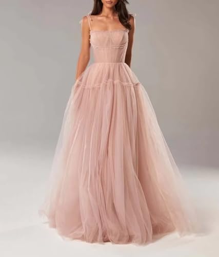 Women's Ball Gown Spaghetti Square Neck Tulle Prom Party Dress Floor Length Sleeveless Flowy A-line Evening Dress