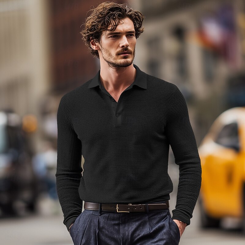 HOT ! Men's Waffle Polo Shirts Golf Shirt Street Casual Lapel Long Sleeve Basic Modern Plain Textured Buttons Spring Fall All Seasons Regular Fit White Black Yellow Red Blue Gray Waffle Polo Shirts