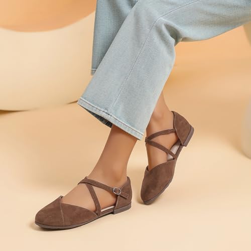 Saidoteto Women's Ankle Strap Flats - relaxing Round Toe Dress Shoes with Adjustable Buckle, Criss-Cross Design for Work, Wedding, Office & Casual. Brown Size 11 WFT240810-03
